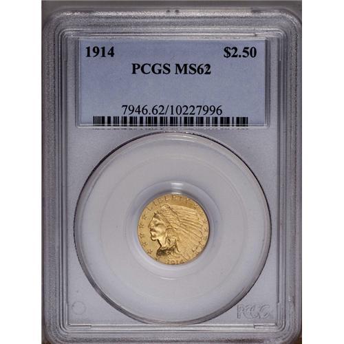 <B>1914 $2 1/2 MS62 PCGS.</B></I> A bright, satiny example of this scarcer, low mintage issue. Well but not fully struck, the surfaces show a number of small but individually insignificant abrasions on each side.<BR><BR><b>Shipping:</b> Coin/Currency (<a target="_blank" href="http://www.heritageauctions.com/common/shipping.php">view shipping information</a>)