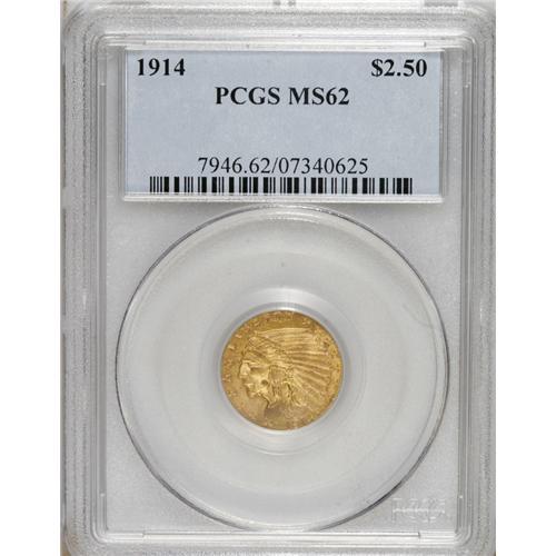 <B>1914 $2 1/2 MS62 PCGS.</B></I> A charming representative with original rich green-gold toning and an above average strike. A better date with the second lowest mintage of the type.<BR><BR><b>Shipping:</b> Coins & Currency (<a target="_blank" href="http://www.heritageauctions.com/common/shipping.php">view shipping information</a>)