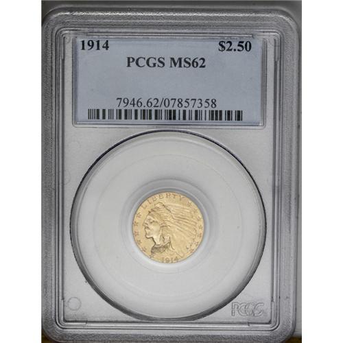 <B>1914<$2 1/2> MS62 PCGS.</B></I> A typical example with frosty luster and light yellow-gold surfaces. A few faint hairlines and other minute imperfections can be seen on each side. The design elements are nicely defined, although this is clearly not a full strike.