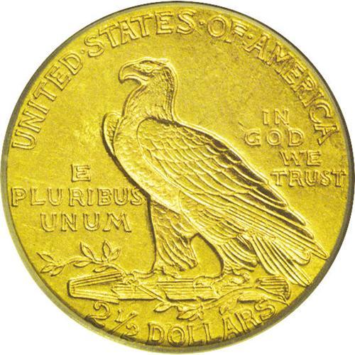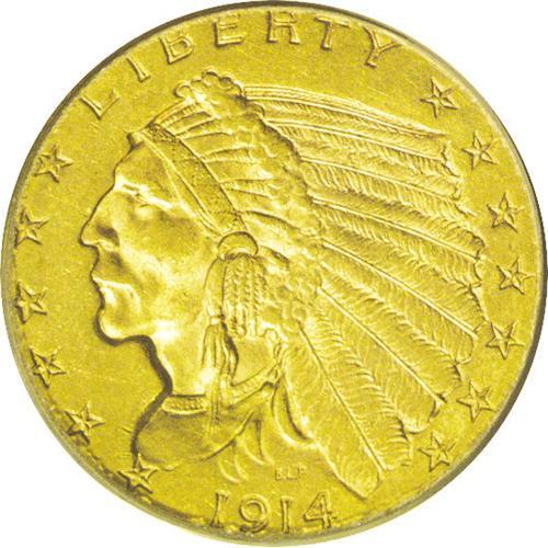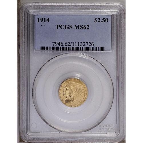 <B>1914<$2 1/2> MS62 PCGS.</B></I> Always a collector-favorite because of its low mintage, this 1914 has bright yellow-gold surfaces and shows just a touch of softness over the highpoints of the design elements.