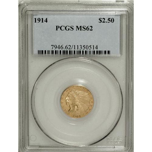 <B>1914 $2 1/2 MS62 PCGS.</B></I> Satiny and suitably struck with pale straw-gold surfaces. A few light abrasions are noted in the obverse fields, on each side. An important semi-key date in the Indian quarter eagle series.<BR><BR><b>Shipping:</b> Coins & Currency (<a target="_blank" href="http://www.heritageauctions.com/common/shipping.php">view shipping information</a>)