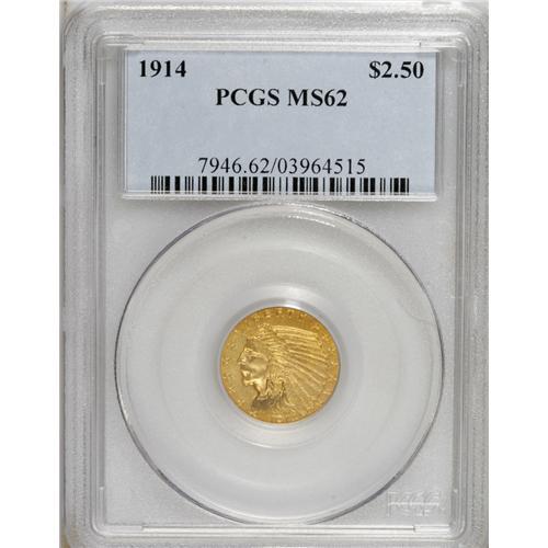 <B>1914 $2 1/2 MS62 PCGS.</B></I> Lustrous apricot-gold surfaces reveal sharply struck motifs, including good definition on the eagle's shoulder. A few minute handling marks are noted, especially on the reverse. The 1914 has the second lowest mintage of the Indian Head quarter eagle series (240,000 business strikes).<BR><BR><b>Shipping:</b> Coins & Currency (<a target="_blank" href="http://www.heritageauctions.com/common/shipping.php">view shipping information</a>)