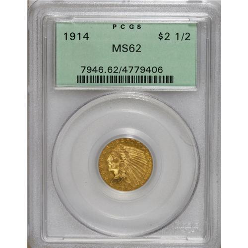<B>1914 $2 1/2 MS62 PCGS.</B></I> Subtly lustrous with slightly hazy orange-gold surfaces that have glints of emerald. Well-defined with a number of small, yet grade-defining abrasions on the devices.<BR><BR><b>Shipping:</b> Coins & Currency (<a target="_blank" href="http://www.heritageauctions.com/common/shipping.php">view shipping information</a>)