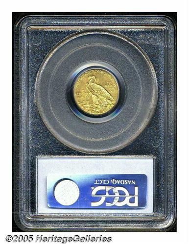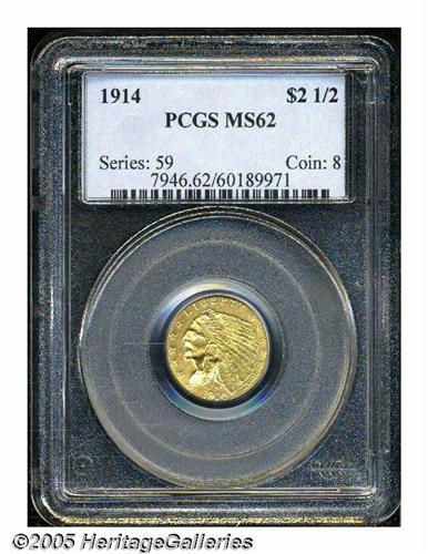 <B>1914<$2 1/2> MS62 PCGS.</B></I> This bright 1914 Indian quarter eagle exhibits brassy-gold surfaces that reveal a few minor marks on the Indian's cheek and in the open exposed fields. The design features are well impressed throughout.