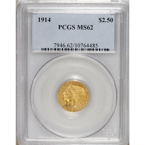 <B>1914 $2 1/2 MS62 PCGS.</B></I> This low mintage Indian quarter eagle has an above average strike and lacks mentionable marks. The obverse is especially attractive for the designated grade.<BR><BR><b>Shipping:</b> Coins & Currency (<a target="_blank" href="http://www.heritageauctions.com/common/shipping.php">view shipping information</a>)