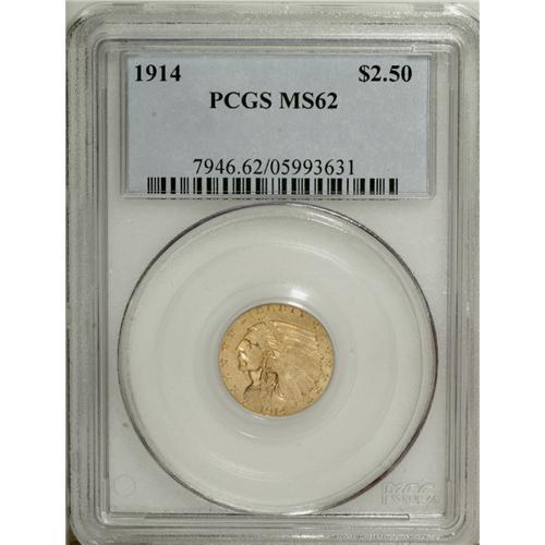 <B>1914 $2 1/2 MS62 PCGS.</B></I> This luminous gold-orange quarter eagle has strong peripheral detail, though the centers display softness. Light marks affect the fields, and a significant abrasion affects parts of IN GOD on the reverse.<BR><BR><b>Shipping:</b> Coin/Currency (<a target="_blank" href="http://www.heritageauctions.com/common/shipping.php">view shipping information</a>)