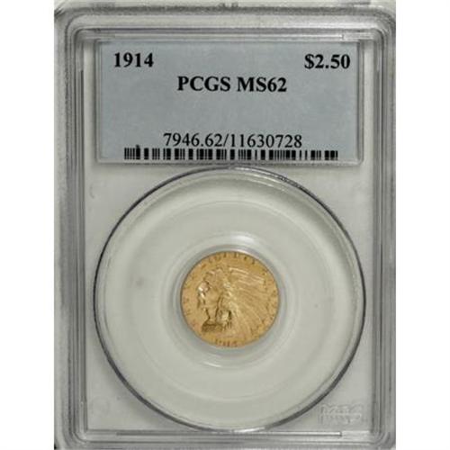 <B>1914 $2 1/2 MS62 PCGS.</B></I> A sharply struck, lightly abraded straw-gold representative of this lower-mintage Indian quarter eagle issue, highly lustrous and pleasing. The 1914 becomes elusive and considerably more expensive any finer.<BR><BR><B>Coin Engraver:</B> Bela Lyon Pratt<BR><BR><b>Shipping:</b> Coins & Currency (<a target="_blank" href="http://www.heritageauctions.com/common/shipping.php">view shipping information</a>\)