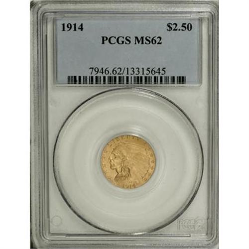 <B>1914 $2 1/2 MS62 PCGS.</B></I> Wonderful luster and a great overall look, with perhaps a bit to many light hairlines to allow a finer grade. Softly colored a pleasing pink-gold. The 1914 quarter eagle, with the second lowest mintage (240,000 pieces) in the series, is one of the keys to completing the set.<BR><BR><B>Coin Engraver:</B> Bela Lyon Pratt<BR><BR><b>Shipping:</b> Coins & Currency (<a target="_blank" href="http://www.heritageauctions.com/common/shipping.php">view shipping information</a>)