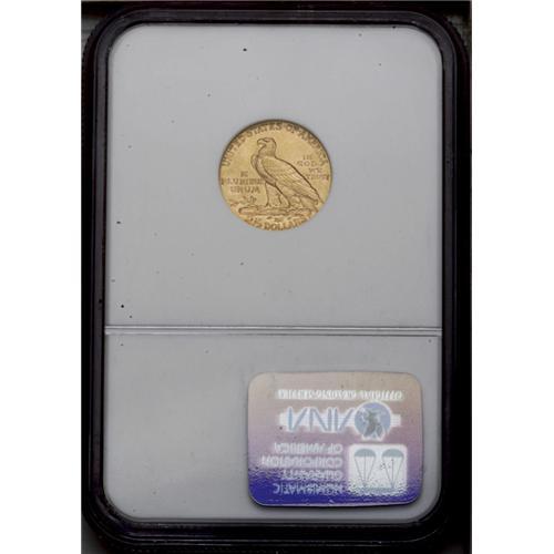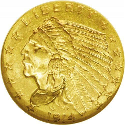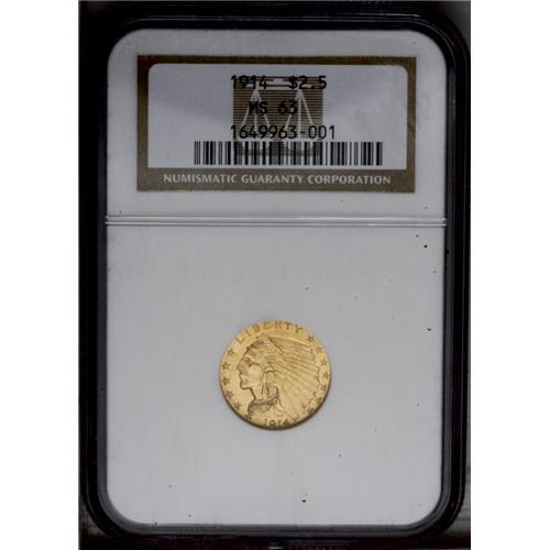 <B>1914<$2 1/2> MS63 NGC.</B></I> Fairly lustrous surfaces with pleasing copper-gold color and few mentionable abrasions, but a trifle softly struck through the center, as often seen on this difficult semi-key issue. A single light scrape from the Indian's nose to the rim nearby bears mention. <BR><BR><B>Important notice:</B> Heritage usually auctions material at the rate of 200-250 lots per hour. On some occasions eBay Live bid software or the Internet may not be able to keep up with the pace of the auction. We recommend placing a realistic absentee bid now as insurance to avoid disappointment. Occasionally the auctioneer may eliminate or reject an eBay Live bid, and the auctioneer may also reopen a lot after the close of the eBay live bidding (usually because we missed an audience bid), and may reject your bid even if it shows you as the winning bidder. By bidding via eBay Live, you agree that Heritage may award the lot to another bidder at its sole discretion under the circumstances described above or any other reasonable circumstances. Since eBay bids are not shown to us until we open the lot on the floor, we treat those bids just like floor bids. In most cases the floor responds before the eBay bid is presented to us, due to Internet lag time, so for consistency we have made it a policy that floor bids are always considered first over tie eBay live bids. Also please note that all Heritage lots purchased through eBay Live carry a 20% Buyer's Premium. Please make sure you read the Terms and Conditions before you bid. This lot is being auctioned in conjunction with a live floor auction by Heritage Galleries & Auctioneers. All final auction and invoice information will be supplied by Heritage Galleries & Auctioneers, and all other information should be considered preliminary. Lot:2502 <BR><BR><B>Winning Notification and Billing:</B> After the FINAL session in this auction is complete, Heritage will send e-mail and snail mail invoices. This process normally takes several days. All final auction and invoice information will be supplied by Heritage Galleries & Auctioneers, and all other information should be considered preliminary. <BR><BR>This auction will be conducted on a live auction floor and over the Internet through eBay Live. If you choose to place an absentee bid, please take a moment to <font color='#0000ff'><u><a href='http://pages.ebay.com/liveauctions/help/before/laabsentee.html'>learn how eBay Live absentee bidding works</a></u></font><font color='#000000'>