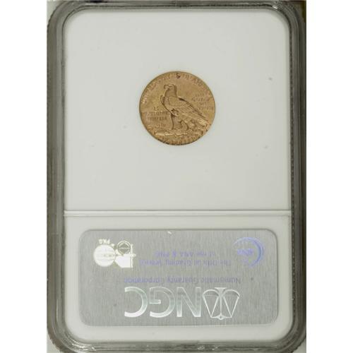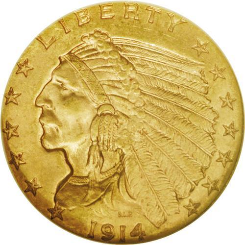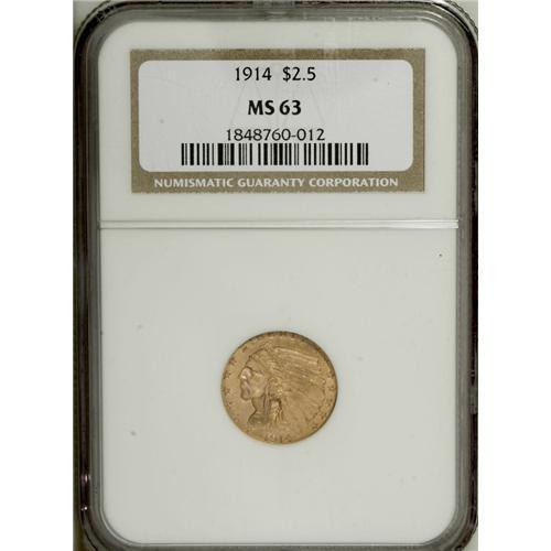 <B>1914 $2 1/2 MS63 NGC.</B></I> The 1914 quarter eagle is challenging in the Select Uncirculated level of preservation. The example in this lot possesses good luster and tan-gold patination with yellow-gold accents. The strike is sharp, resulting in strong definition on most of the feathers in the bonnet, as well as those on the eagle. Some handling marks are noted on the raised, exposed fields, especially those on the reverse.<BR><BR><b>Shipping:</b> Coins & Currency (<a target="_blank" href="http://www.heritageauctions.com/common/shipping.php">view shipping information</a>)
