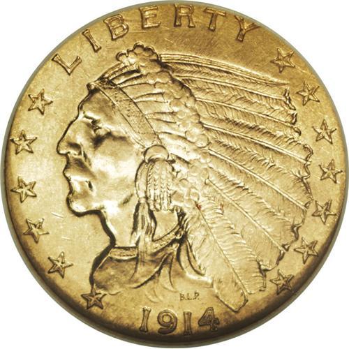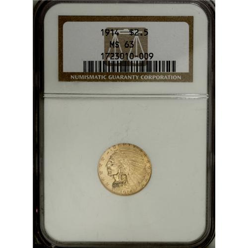 <B>1914 $2 1/2 MS63 NGC.</B></I> This satiny representative has straw-gold devices and green-gold fields. A good strike, since the headdress feathers exhibit only slight blending. Wispy grazes near the rims are noted, but are unimportant to the eye appeal. The low mintage 1914 ranks only after the 1911-D on want lists for the type.<BR><BR><b>Shipping:</b> Coin/Currency (<a target="_blank" href="http://www.heritageauctions.com/common/shipping.php">view shipping information</a>)
