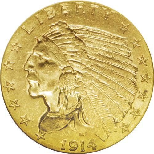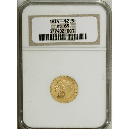 <B>1914 $2 1/2 MS63 NGC.</B></I> This softly lustrous yellow-orange piece displays an unusually sharp strike, which includes full definition on the pendant and eagle. The devices are comparatively clean, though a number of light marks and grazes affect the fields, as does a small copper spot near 3 o'clock on the obverse.<BR><BR><b>Shipping:</b> Coin/Currency (<a target="_blank" href="http://www.heritageauctions.com/common/shipping.php">view shipping information</a>)