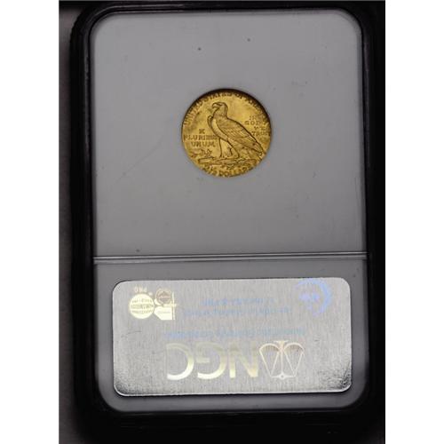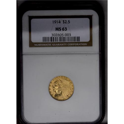<B>1914<$2 1/2> MS63 NGC.</B></I> Well struck with good mint luster and pleasing coloration. A pair of faint pinscratches are noted on the upper left reverse quadrant. An attractive example of this better issue in the Indian quarter eagle series.