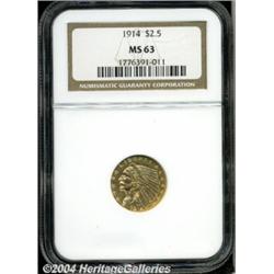 <B>1914<$2 1/2> MS63 NGC.</B></I> An impressive example of this scarcer, semi-key issue in the Indian quarter eagle series. The satiny mint luster is interrupted by a few small milling marks on each side, but these are the only mentionable flaws on this Select specimen.<BR><I>From The Sarasota Collection.</B></I> <BR><BR><B>Important notice:</B> Heritage usually auctions material at the rate of 200-250 lots per hour. On some occasions eBay Live bid software or the Internet may not be able to keep up with the pace of the auction. We recommend placing a realistic absentee bid now as insurance to avoid disappointment. Occasionally the auctioneer may eliminate or reject an eBay Live bid, and the auctioneer may also reopen a lot after the close of the eBay live bidding (usually because we missed an audience bid), and may reject your bid even if it shows you as the winning bidder. By bidding via eBay Live, you agree that Heritage may award the lot to another bidder at its sole discretion under the circumstances described above or any other reasonable circumstances. Since eBay bids are not shown to us until we open the lot on the floor, we treat those bids just like floor bids. In most cases the floor responds before the eBay bid is presented to us, due to Internet lag time, so for consistency we have made it a policy that floor bids are always considered first over tie eBay live bids. Also please note that all Heritage lots purchased through eBay Live carry a 20% Buyer's Premium. Please make sure you read the Terms and Conditions before you bid. </span></font></tr></table></td></tr></table>
