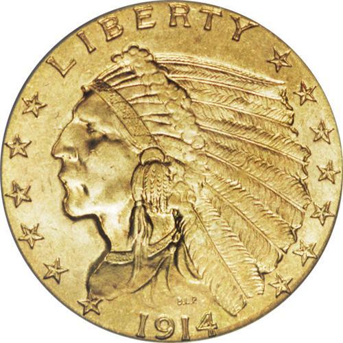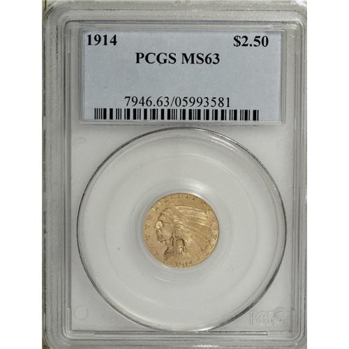 <B>1914 $2 1/2 MS63 PCGS.</B></I> A solidly struck and satiny greenish-gold piece. This semi-key is high on collectors' want lists, particularly in Mint State. A small copper spot resides in front of the eagle's breast. A few wispy scattered marks in the fields do not detract from the desirability of this attractive quarter eagle.<BR><BR><b>Shipping:</b> Coin/Currency (<a target="_blank" href="http://www.heritageauctions.com/common/shipping.php">view shipping information</a>)
