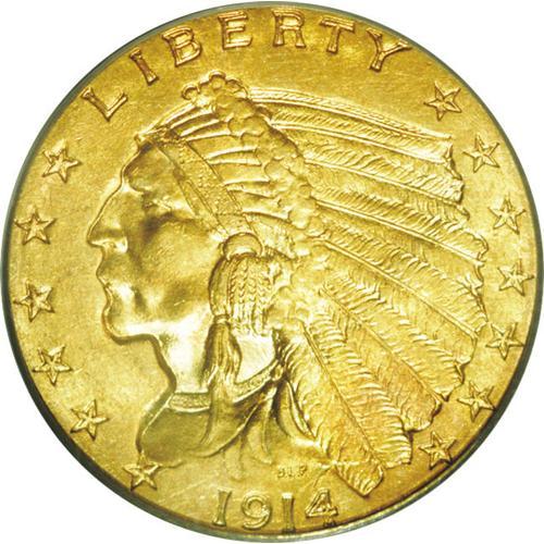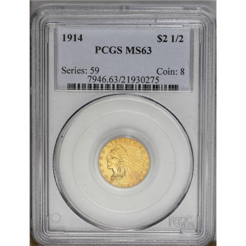 <B>1914<$2 1/2> MS63 PCGS.</B></I> A suitably struck honey-gold and reddish-gold representative that has no singularly detrimental marks. The Indian quarter eagle series is uniquely collectible by date and mintmark, and the 1914, with its low mintage of 240,000 pieces, is easily the second scarcest issue. Aside from the 1911-D, no other date has a production below 375,000 coins.