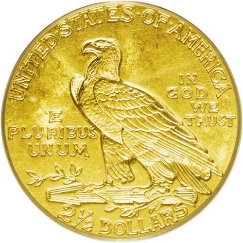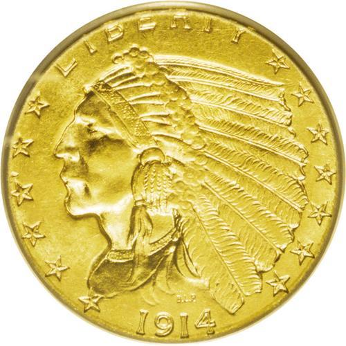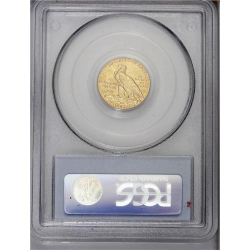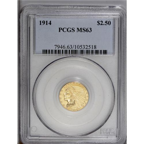 <B>1914<$2 1/2> MS63 PCGS.</B></I> Well struck with pleasing satin luster and essentially honey-gold coloration that has a distinctly greenish cast. A few tiny contact marks reside on the reverse fields, while the obverse seems mark-free. A minute planchet flaw rests between obverse stars 4 and 5. One of the better dates in the Indian quarter eagle series in Select or better condition.