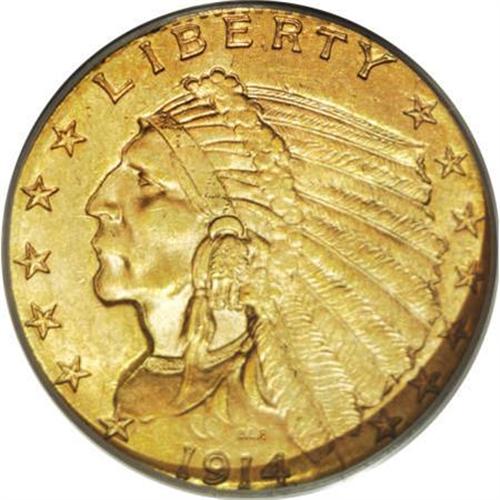 <B>1914 $2 1/2 MS63 PCGS.</B></I> Honey-gold patination covers the lustrous surfaces of this Select 1914 quarter eagle, and a solid strike left excellent detail on the design elements. A few minute handling marks preclude a higher grade. Michael Fuljenz and Douglas Winter (2001) say this "... is the second rarest Indian Head quarter eagle in terms of its overall rarity and it is one of the rarest in high grades."<BR><BR><B>Coin Engraver:</B> Bela Lyon Pratt<BR><BR><b>Shipping:</b> Coins & Currency (<a target="_blank" href="http://www.heritageauctions.com/common/shipping.php">view shipping information</a>\)