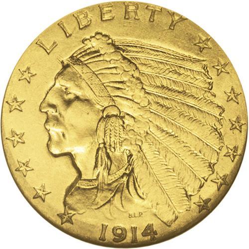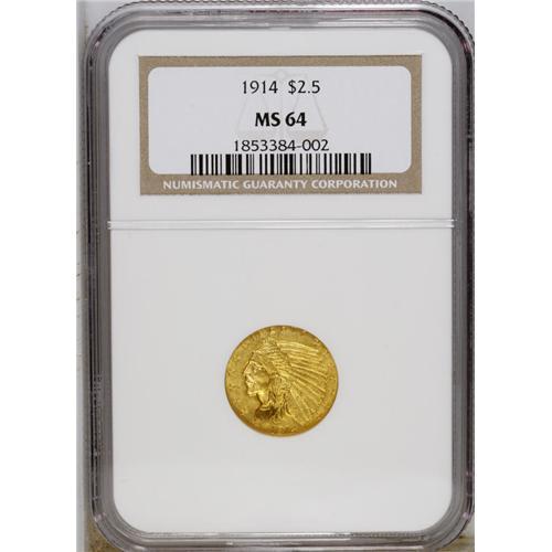 <B>1914 $2 1/2 MS64 NGC.</B></I> Honey-gold and olive tones confirm the originality of this satiny near-Gem. This strike is generally crisp, with minor incompleteness noted on the base of the base and the lower region of the headdress. A popular low mintage date that rapidly becomes rare with progressively higher Mint State grades.<BR><BR><b>Shipping:</b> Coin/Currency (<a target="_blank" href="http://www.heritageauctions.com/common/shipping.php">view shipping information</a>)