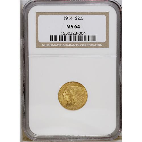<B>1914 $2 1/2 MS64 NGC.</B></I> Only the 1911-D quarter eagle has a mintage lower than the 240,117 examples struck in Philadelphia during 1914. This near-Gem example has fully lustrous surfaces with subdued mint frost on both sides. A few scattered surface marks are all that prevented a Gem grade decision by NGC.<BR><BR><b>Shipping:</b> Coin/Currency (<a target="_blank" href="http://www.heritageauctions.com/common/shipping.php">view shipping information</a>)