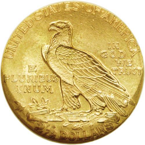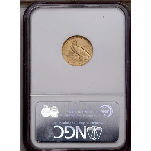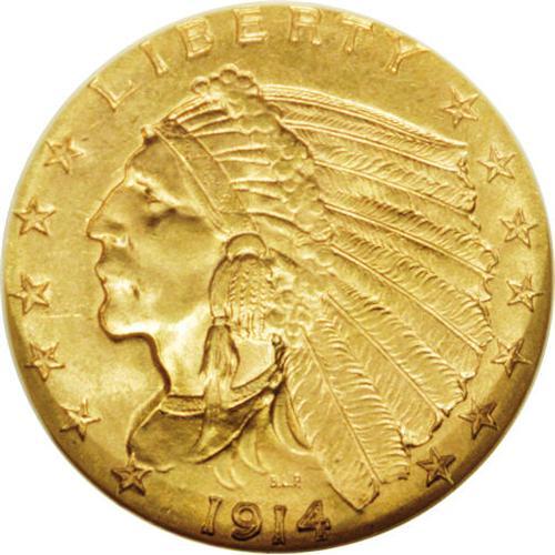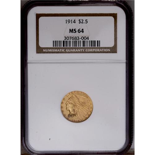 <B>1914<$2 1/2> MS64 NGC.</B></I> The 1914 quarter eagle, with the second lowest mintage (240,000 pieces) in the series, is one of the keys to completing the set. The near-Gem presented here displays semi-bright peach-gold surfaces with traces of light tan. The luster is a bit subdued, as is characteristic of this issue. Strike definition is nearly complete, with most of the detail apparent in the headdress and on the eagle's feathers. Minute contact and slide marks occur on the Indian's face and in the raised, exposed fields of both sides. NGC has certified 34 specimens finer (2/06).