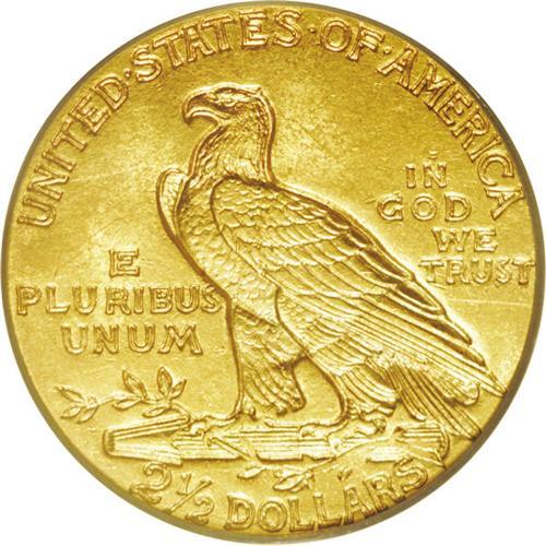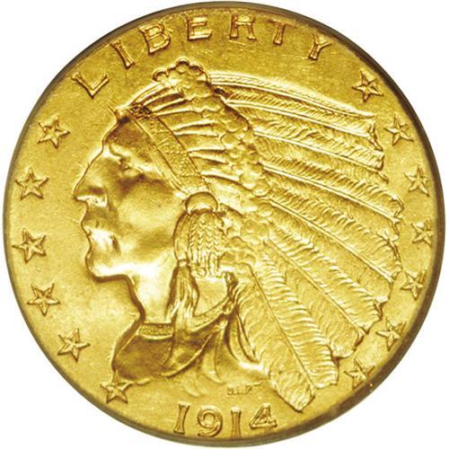 <B>1914<$2 1/2> MS64 PCGS.</B></I> Highly lustrous yellow surfaces with soft, frosty texture. A pleasing example with excellent eye appeal. This is a scarce, lower mintage date that is a condition rarity in finer grades. PCGS has only certified 46 finer quality examples. Faint hairlines and minor abrasions undoubtedly serve to limit the grade of this Choice Mint State coin.