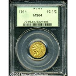 <B>1914<$2 1/2> MS64 PCGS.</B></I> One of the scarcest of all Indian Quarter Eagles and a challenging condition scarcity. Both sides exhibit an abundant amount of rich golden-orange patina. A lovely example of this highly desirable Quarter Eagle. <BR><BR><B>Important notice:</B> Heritage usually auctions material at the rate of 200-250 lots per hour. On some occasions eBay Live bid software or the Internet may not be able to keep up with the pace of the auction. We recommend placing a realistic absentee bid now as insurance to avoid disappointment. Occasionally the auctioneer may eliminate or reject an eBay Live bid, and the auctioneer may also reopen a lot after the close of the eBay live bidding (usually because we missed an audience bid), and may reject your bid even if it shows you as the winning bidder. By bidding via eBay Live, you agree that Heritage may award the lot to another bidder at its sole discretion under the circumstances described above or any other reasonable circumstances. Since eBay bids are not shown to us until we open the lot on the floor, we treat those bids just like floor bids. In most cases the floor responds before the eBay bid is presented to us, due to Internet lag time, so for consistency we have made it a policy that floor bids are always considered first over tie eBay live bids. Also please note that all Heritage lots purchased through eBay Live carry a 20% Buyer's Premium. Please make sure you read the Terms and Conditions before you bid. </span></font></tr></table></td></tr></table>