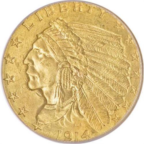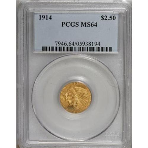 <B>1914 $2 1/2 MS64 PCGS.</B></I> The production of quarter eagles in this first year of World War I was a generous 240,000 coins, and pieces are widely available up to the MS63 grade level. This piece offers softly glowing luster over the antique-gold surfaces, which reveal a single nick beneath the Indian's chin as one of the few mentionable distractions. PCGS has certified only 46 coins finer (8/07).<BR><BR><B>Coin Engraver:</B> Bela Lyon Pratt<BR><BR><b>Shipping:</b> Coins & Currency (<a target="_blank" href="http://www.heritageauctions.com/common/shipping.php">view shipping information</a>)