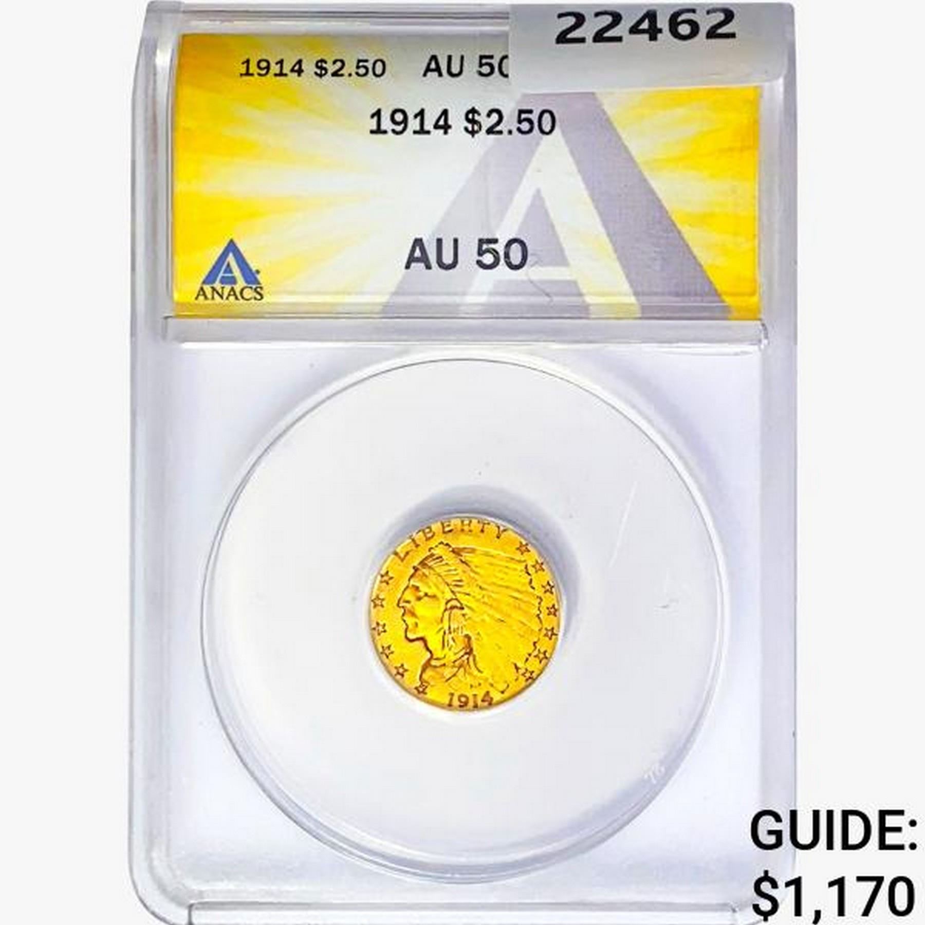 1914 $2.50 Gold Quarter Eagle ANACS AU50