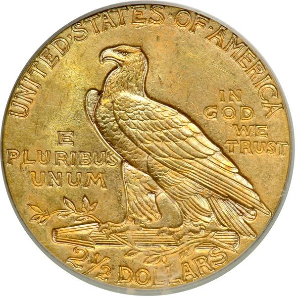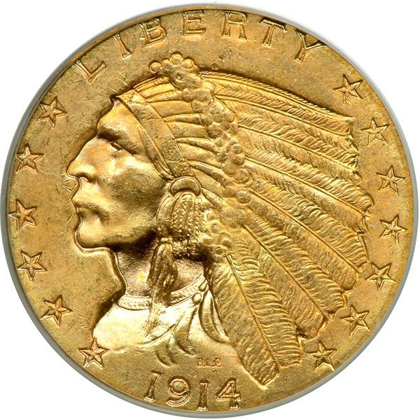 1914 $2.50 Indian. PCGS graded MS-65. Nicely toned. Scarce date in gem condition. In Mint State, the 1914 is typically offered with a sharp strike. The present example confirms this in this regard, and in spades, with all devices crisply delineated from an obviously powerful impression. The color is mostly brilliant in shade, but we do note a somewhat warm-gold sheen at certain angles. Free of individually describable distractions, and housed in a green-insert PCGS holder, the coin is one of the few outstanding Gem MS65 examples graded by the service. The 1914 ranks second in rarity to the 1911-D among the 15 Indian Quarter Eagle deliveries both in an absolute sense and at the MS65 grade level. It is an important issue that can be a real stumbling block to completing a high-quality set. Pop 47; 3 finer; 2 in 66; 1 in 67. (PCGS # 7946) .