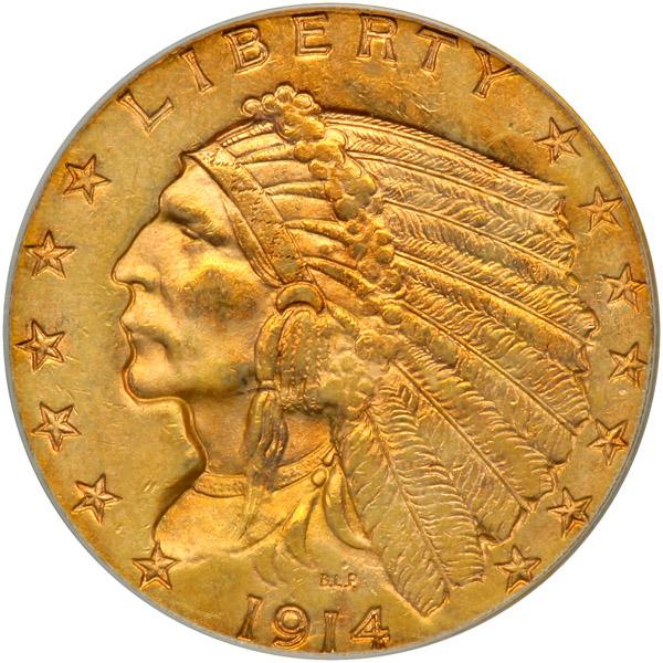 1914 $2.50 Indian. PCGS graded MS-62. Lovely rose color gold, the fields and devices being smooth and abnormally free from contact marks given the modest grade. Bold strike on the main features. Scarce (PCGS # 7946) .