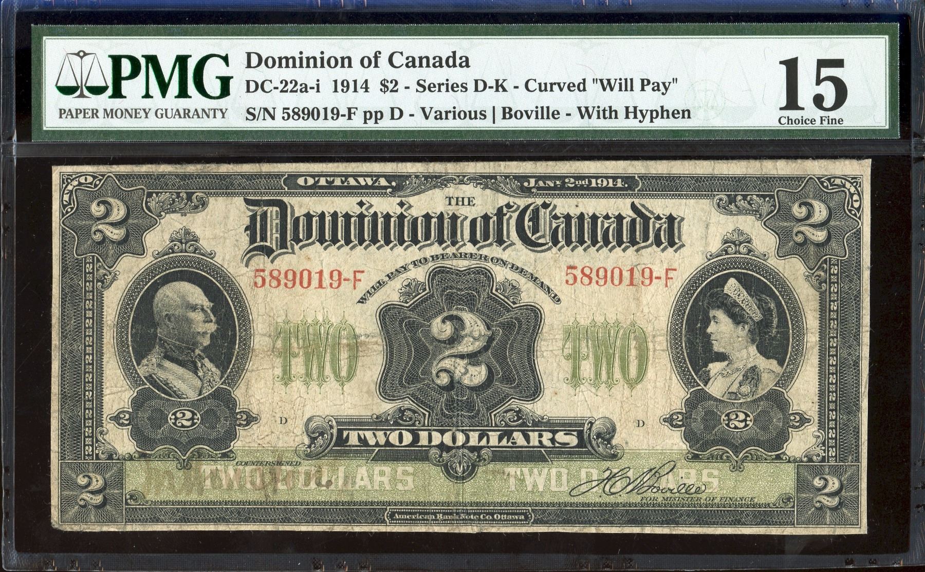 1914 $2 #589019-F DC-22a-i, PMG F-15, designated as trimmed.
