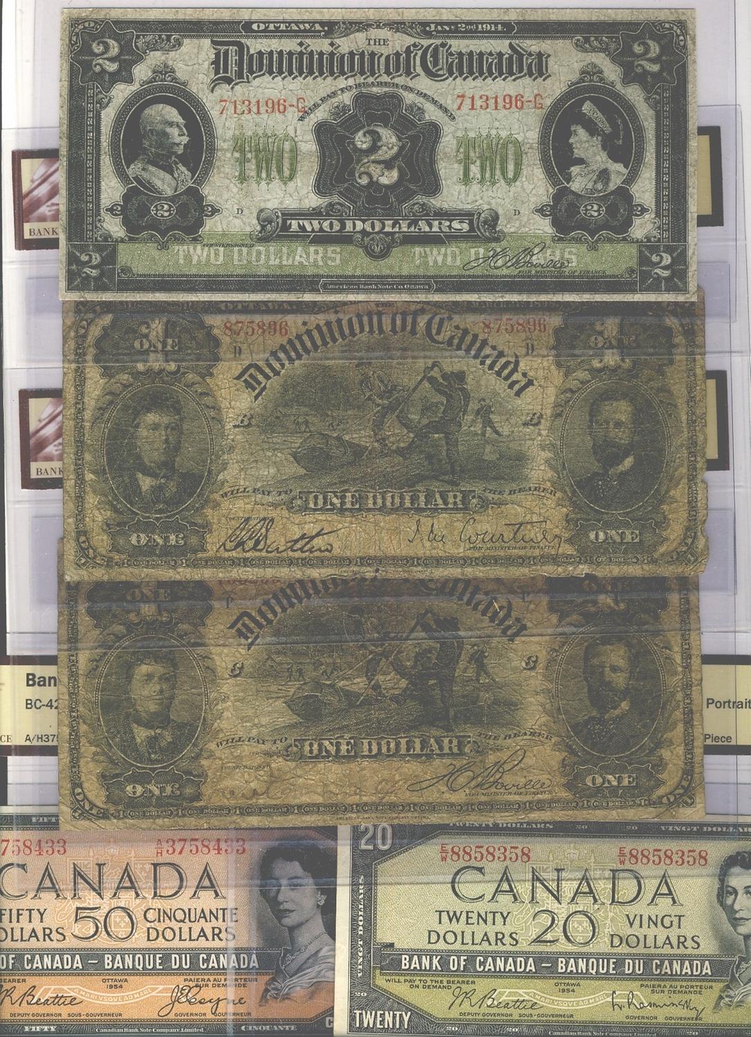 1914 $2 DC-22a-I, VG8, 1898 $1 DC-13b Good 4 & DC-13c Good 6. Lot of 5 Dominion examples all BCS graded. Lot also includes 1954 $20 BC-41b F18 & $50 BC-42a EF40.