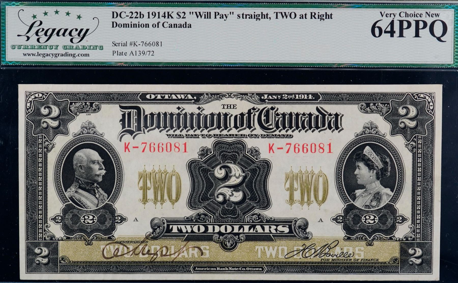 1914 $2 DC-22b #K-766081 "Will Pay straight - TWO at Right" Legacy Currency Grading Choice Uncirculated-64PPQ. Wow factor! This is a Choice issue with great eye appeal, good margins and superb embossing. This would be an important addition and a major highlight of a personal collection. A 'tasty' find for any serious collector and will most certainly serve as an absolute treasure in their collection. Not often seen and offered in this condition. Worth a premium bid.