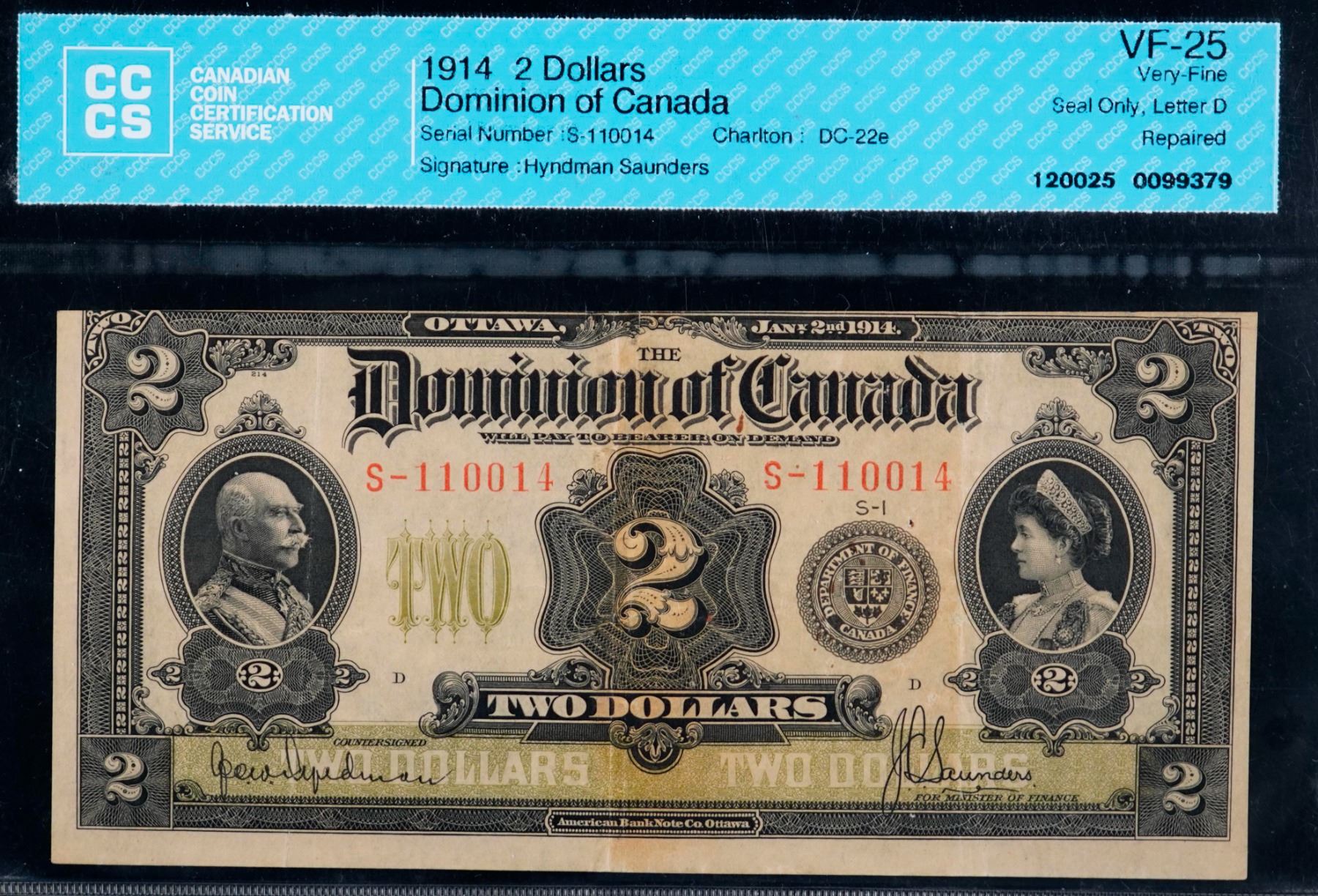 1914 $2 DC-22e #S-110014 CCCS Choice Very Fine-25 Repaired.