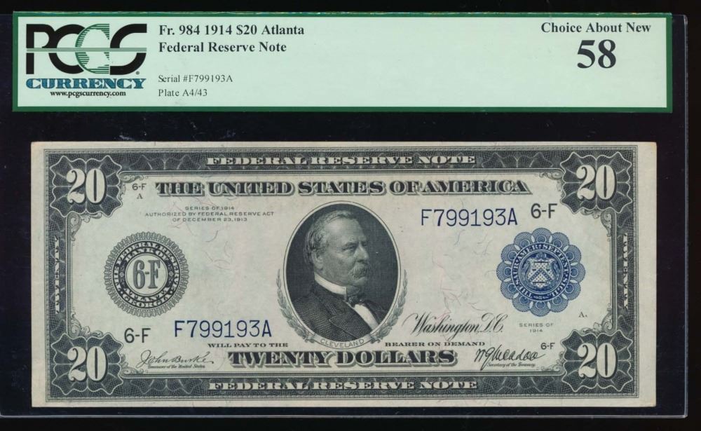 One 1914 $20 Atlanta Federal Reserve Note PCGS 58.