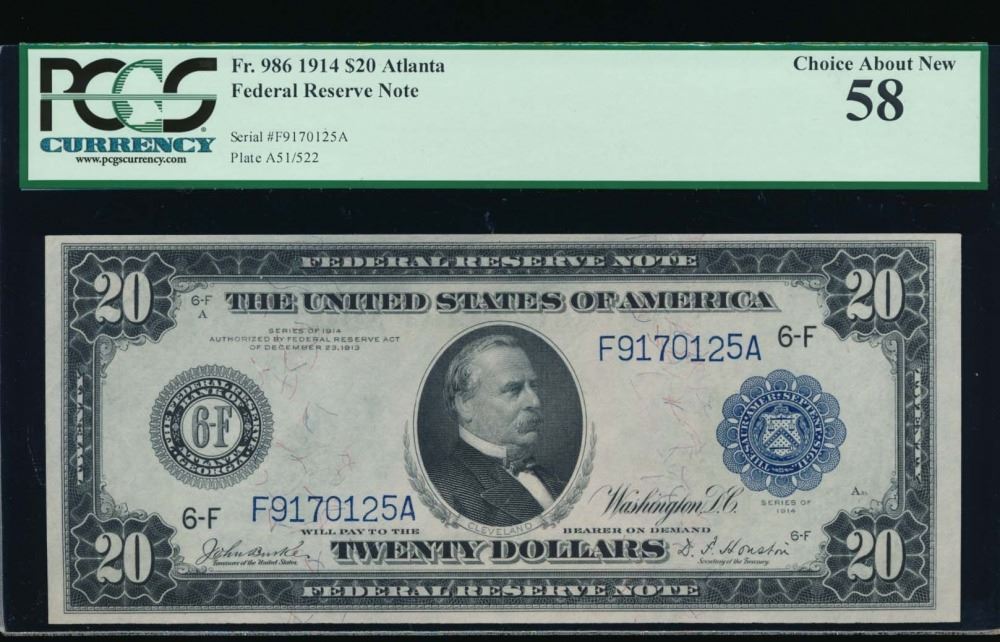One 1914 $20 Atlanta Federal Reserve Note PCGS 58.