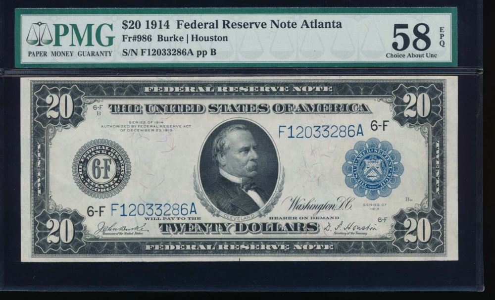 One 1914 $20 Atlanta Federal Reserve Note PMG 58EPQ.