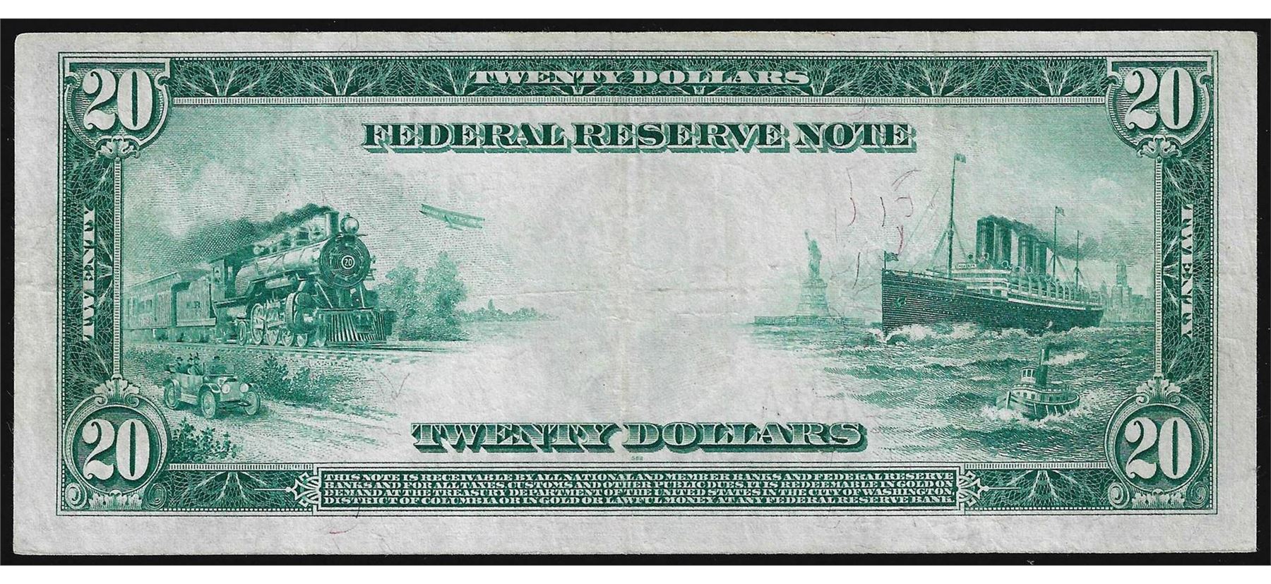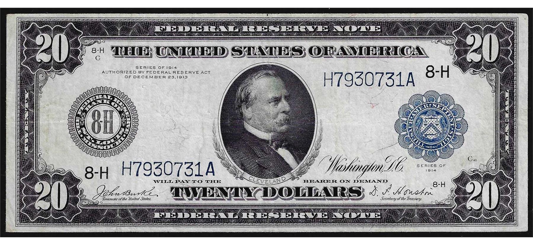 One 1914 $20 Federal Reserve Note Blue Seal.