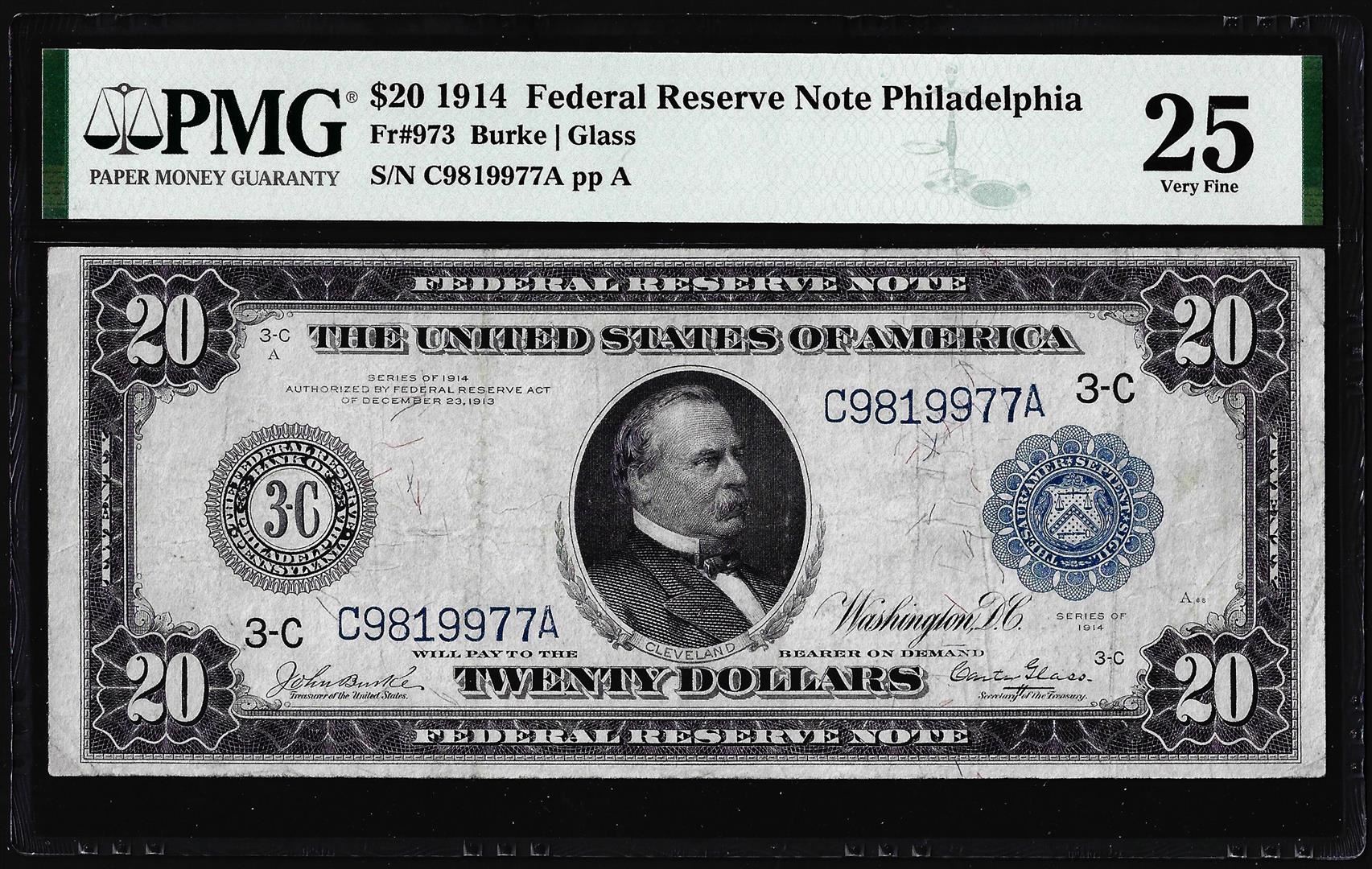 1914 $20 Federal Reserve Note Philadelphia Fr.973 PMG Very Fine 25