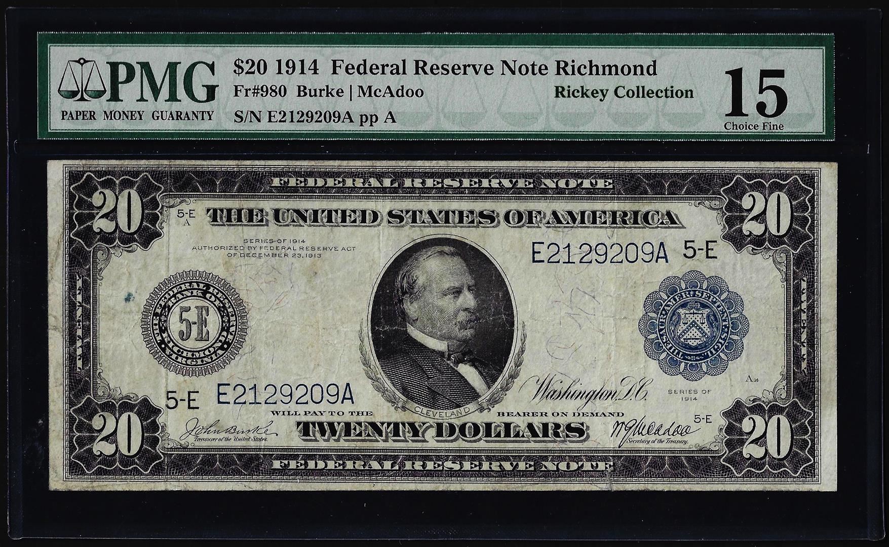 1914 $20 Federal Reserve Note Richmond Fr.980 PMG Choice Fine 15