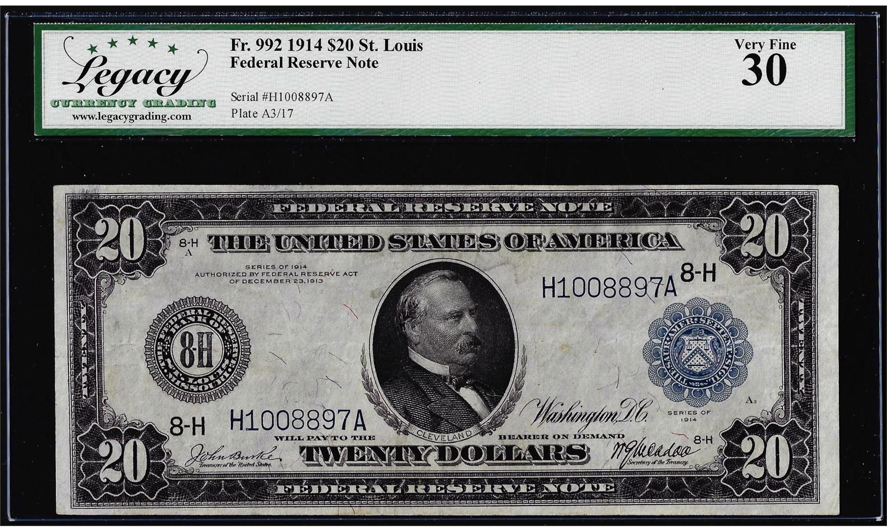 1914 $20 Federal Reserve Note St. Louis Fr. 992 Legacy Very Fine 30