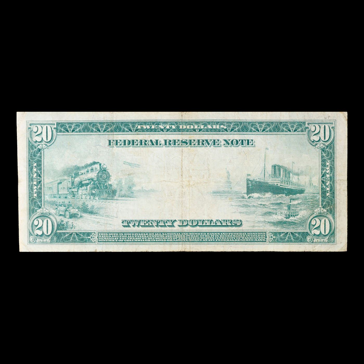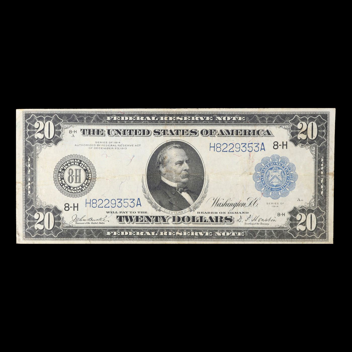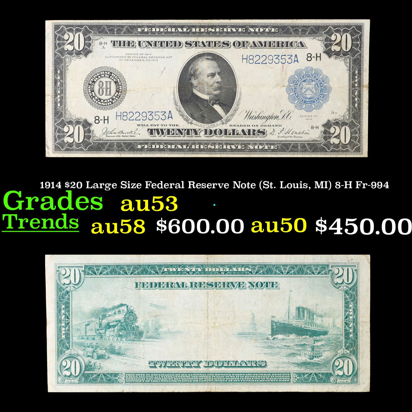 1914 $20 Large Size Federal Reserve Note (8-H St Louis Fr-994 Grades Select AU Despite having 1913 written on them, these are actually from the series of 1914, as it says on the right and left hands side of each note. This large-size Federal Reserve Note features Grover Cleveland's portrait on the face. Vignette on the back titled Land, Sea and Air depicts modes of transportation. With blue seal and serial numbers.