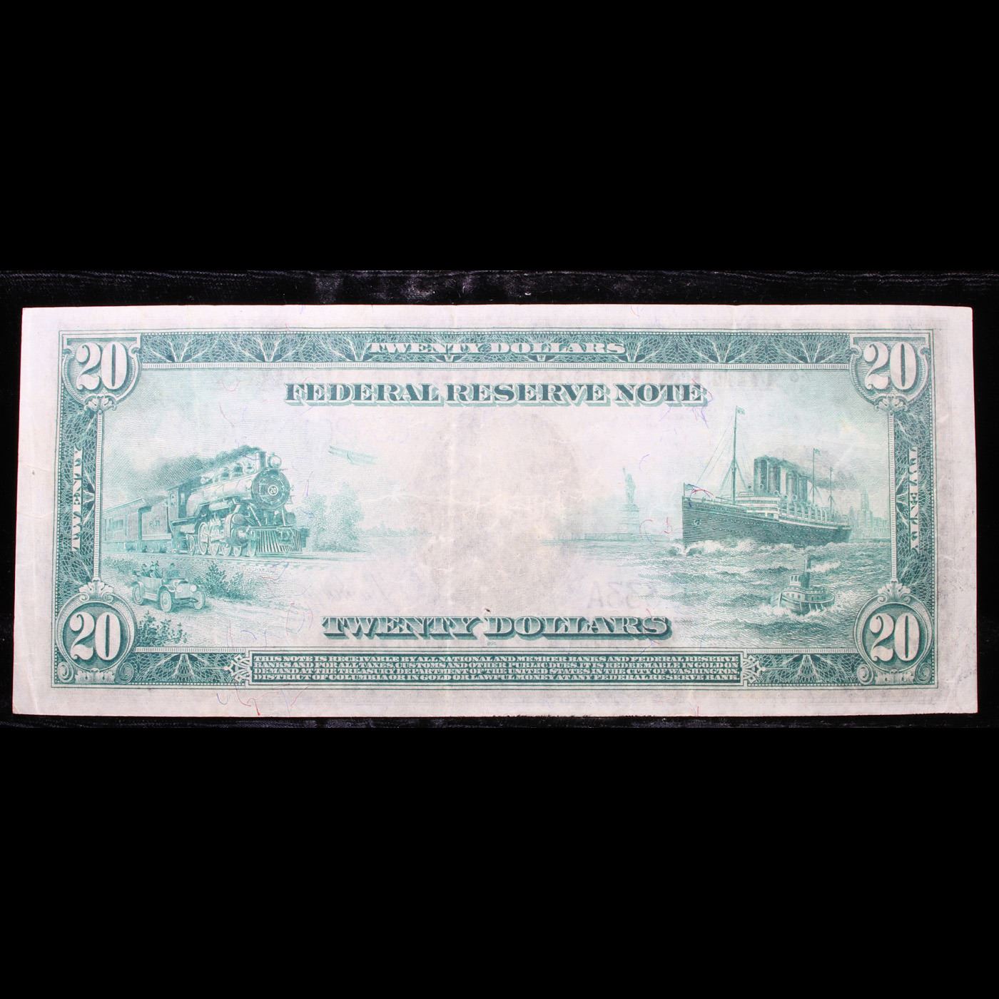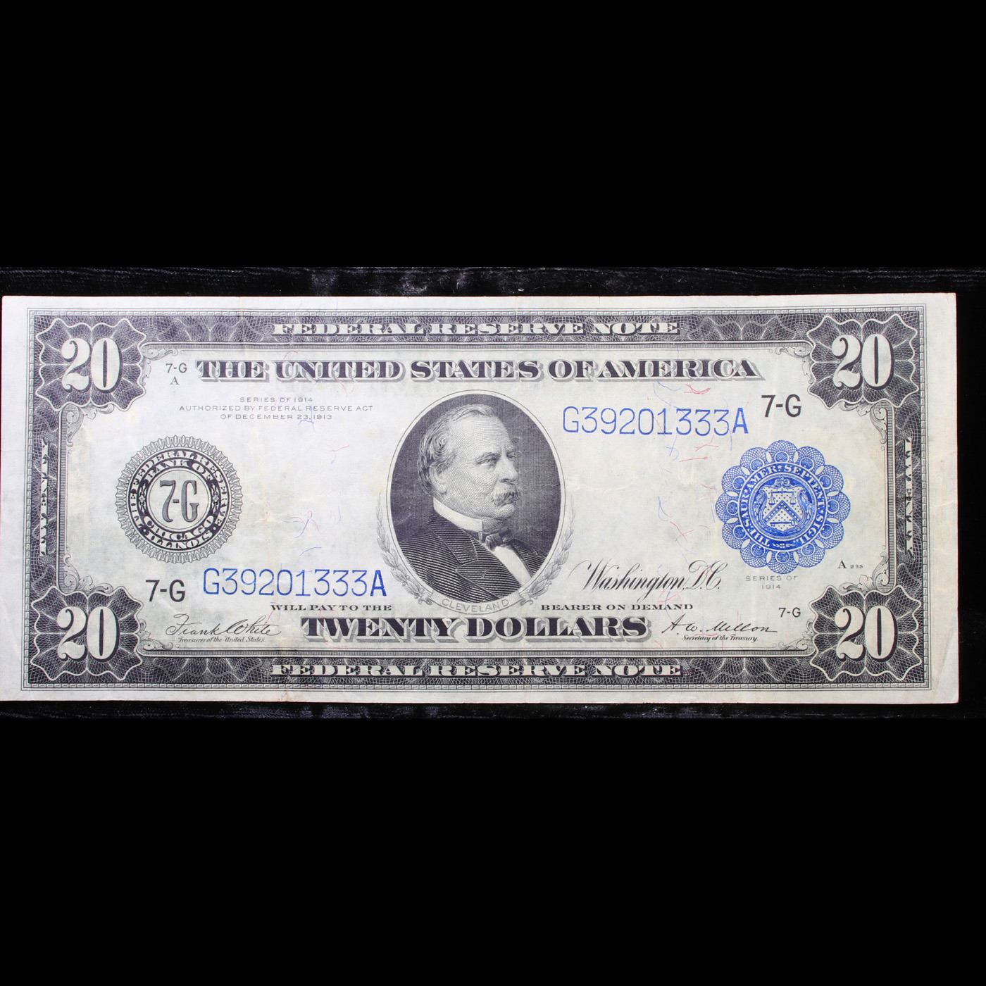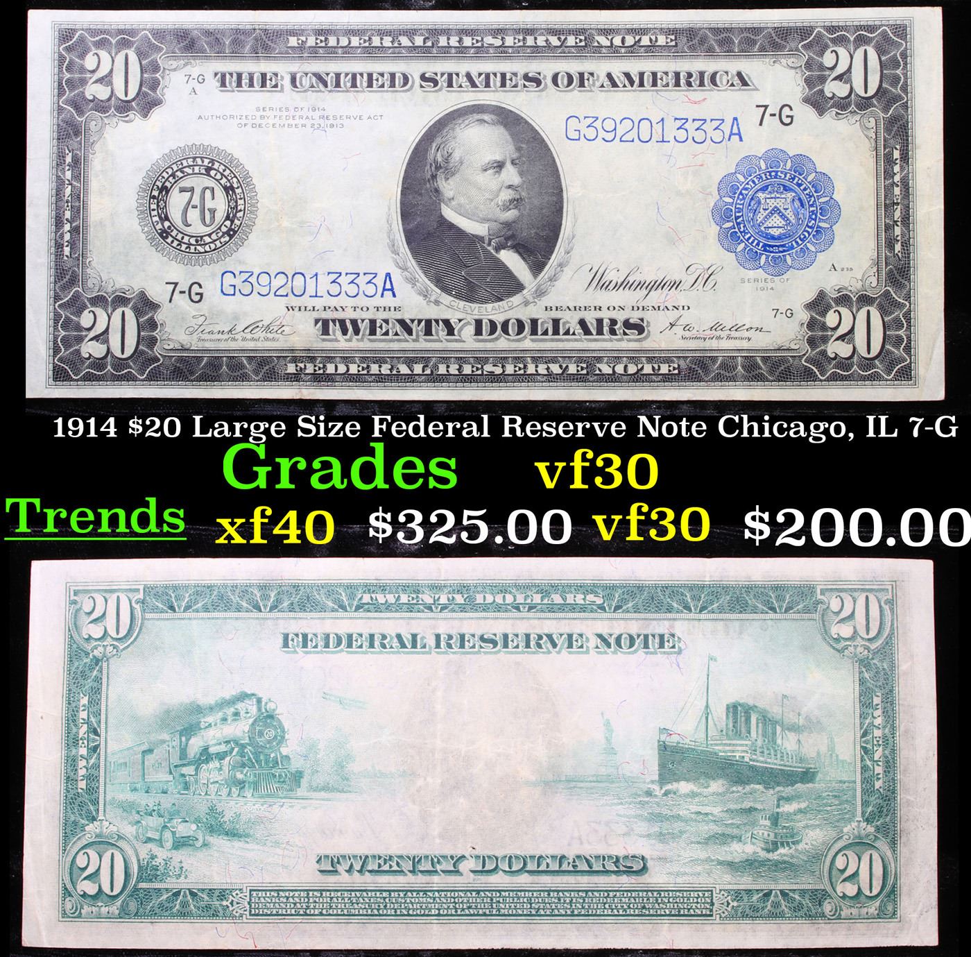 1914 $20 Large Size Federal Reserve Note Chicago, IL 7-G Grades vf++. Despite having 1913 written on them, these are actually from the series of 1914, as it says on the right and left hands side of each note. This large-size Federal Reserve Note features Grover Cleveland's portrait on the face. Vignette on the back titled Land, Sea and Air depicts modes of transportation. With blue seal and serial numbers.