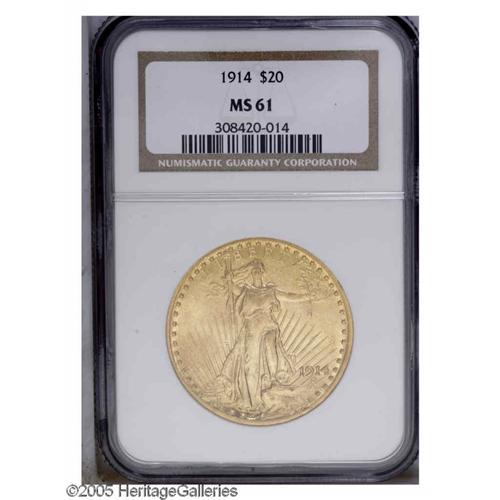 <B>1914<$20> MS61 NGC.</B></I> Lustrous and bright with small imperfections, but fewer than one might expect of the grade. A popular issue because of the extremely low mintage (95,320 pieces).<BR><I>From The Henry R. Luhrs Collection.</B></I>