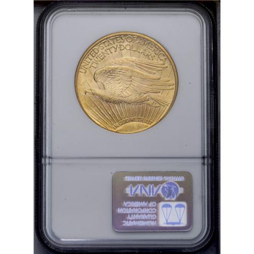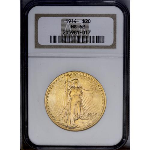 <B>1914<$20> MS62 NGC.</B></I> Apricot shades adorn the central obverse devices, with typical marks on this slightly better date, low mintage Philadelphia issue. <BR><BR><B>Important notice:</B> Heritage usually auctions material at the rate of 200-250 lots per hour. On some occasions eBay Live bid software or the Internet may not be able to keep up with the pace of the auction. We recommend placing a realistic absentee bid now as insurance to avoid disappointment. Occasionally the auctioneer may eliminate or reject an eBay Live bid, and the auctioneer may also reopen a lot after the close of the eBay live bidding (usually because we missed an audience bid), and may reject your bid even if it shows you as the winning bidder. By bidding via eBay Live, you agree that Heritage may award the lot to another bidder at its sole discretion under the circumstances described above or any other reasonable circumstances. Since eBay bids are not shown to us until we open the lot on the floor, we treat those bids just like floor bids. In most cases the floor responds before the eBay bid is presented to us, due to Internet lag time, so for consistency we have made it a policy that floor bids are always considered first over tie eBay live bids. Also please note that all Heritage lots purchased through eBay Live carry a 20% Buyer's Premium. Please make sure you read the Terms and Conditions before you bid. This lot is being auctioned in conjunction with a live floor auction by Heritage Galleries & Auctioneers. All final auction and invoice information will be supplied by Heritage Galleries & Auctioneers, and all other information should be considered preliminary. Lot:4632 <BR><BR><B>Winning Notification and Billing:</B> After the FINAL session in this auction is complete, Heritage will send e-mail and snail mail invoices. This process normally takes several days. All final auction and invoice information will be supplied by Heritage Galleries & Auctioneers, and all other information should be considered preliminary. <BR><BR>This auction will be conducted on a live auction floor and over the Internet through eBay Live. If you choose to place an absentee bid, please take a moment to <font color='#0000ff'><u><a href='http://pages.ebay.com/liveauctions/help/before/laabsentee.html'>learn how eBay Live absentee bidding works</a></u></font><font color='#000000'>