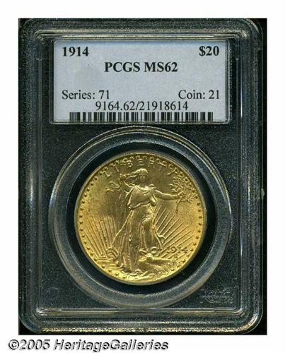 1914 $20 MS62 PCGS. Typically struck, with a blun