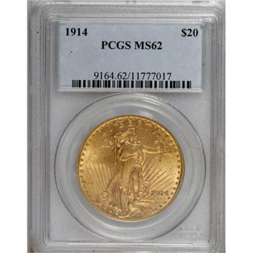 <B>1914 $20 MS62 PCGS.</B></I> Soft, satiny luster is the dominant feature of this well struck yellow-orange double eagle. The tiny abrasions that appear on each side are individually insignificant, though they combine to account for the grade. An interesting example of this lower-mintage Saint-Gaudens issue, one of only 95,200 pieces coined.<BR><BR><B>Coin Engraver:</B> Augustus Saint-Gaudens<BR><BR><b>Shipping:</b> Coins & Currency (<a target="_blank" href="http://www.heritageauctions.com/common/shipping.php">view shipping information</a>)