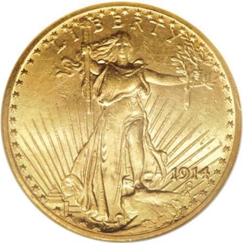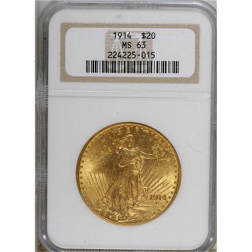 <B>1914 $20 MS63 NGC.</B></I> This shimmering yellow-gold Saint-Gaudens twenty has a bold strike and only moderate obverse marks. Liberty's chest and raised knee exhibit honey and steel-blue toning. A favorite issue for speculators, due to its low mintage of 95,250 pieces, the smallest production of any Philadelphia Motto date.<BR><BR><B>Coin Engraver:</B> Augustus Saint-Gaudens<BR><BR><b>Shipping:</b> Coins & Currency (<a target="_blank" href="http://www.heritageauctions.com/common/shipping.php">view shipping information</a>)