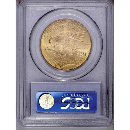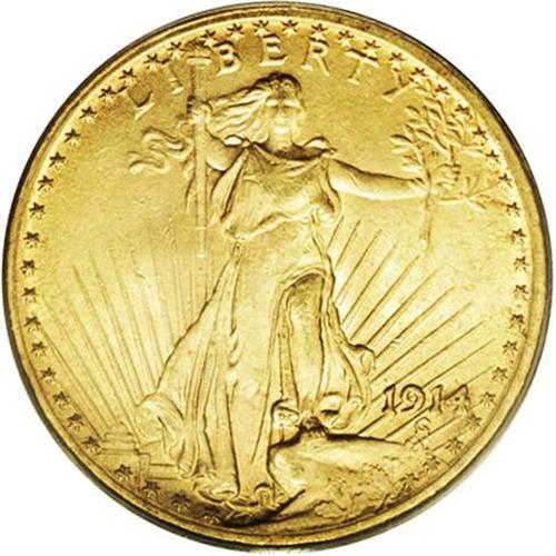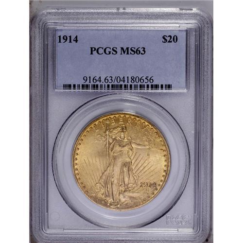 <B>1914<$20> MS63 PCGS.</B></I> A light golden-brown example with good luster and a reasonable strike. No significant marks are located. The 1914 has the lowest Philadelphia production of the series, if the High Reliefs are not included. Only 95,250 pieces were struck, which compares favorably with the nearly 1.5 million pieces struck in San Francisco the same year.